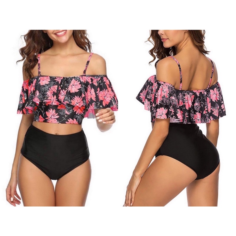 M M 60 Pink Flounce Halter Top With Floral Print High Waist Bikini Bottom Very well made.