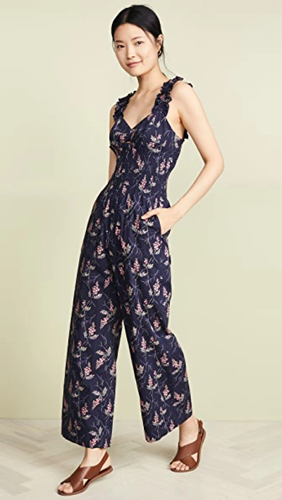 Rebecca Taylor Navy Blue Floral IVIE Smocked Wide Leg Ruffle Strap Jumpsuit 6 80 From Kimberly Very well made.