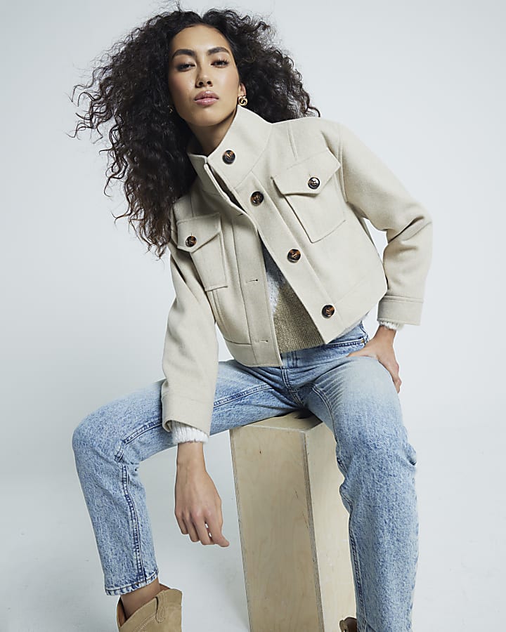 Beige Funnel Neck Crop Jacket Very well made.