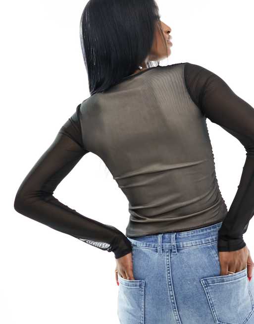 ASOS DESIGN mesh ruched front long sleeve top in black Very well made.