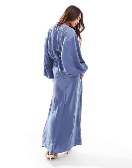 ASOS DESIGN Hochgeschlossenes Satin Maxikleid in Schieferblau mit Fledermausarmeln und geraffter Taille Very well made.