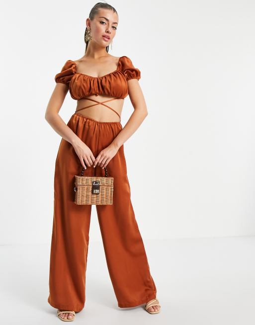 ASOS DESIGN Satin Jumpsuit mit Taillenschnurung im Milchmadchen Stil ASOS Very well made.