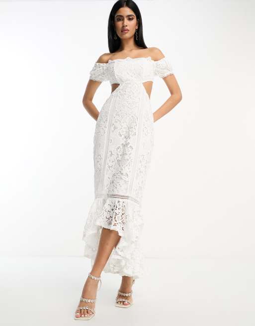 ASOS DESIGN Maxikleid aus Spitze mit Bardotausschnitt Volantsaum und Zierausschnitt in WeiB ASOS Very well made.