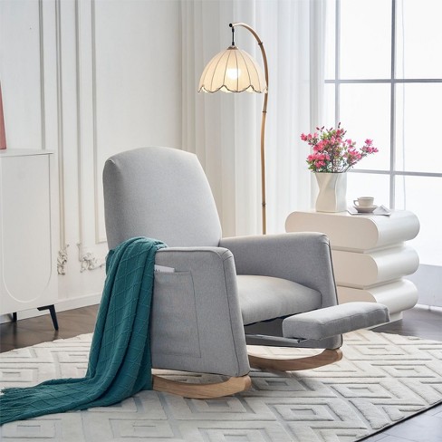 Light Gray Nursery Rocking Chair Recliner Breastfeeding Chair Best Nursery Chair For Small Spaces Linen Fabric Rocking Chair With Leg Rest Cuddlewood Very well made.